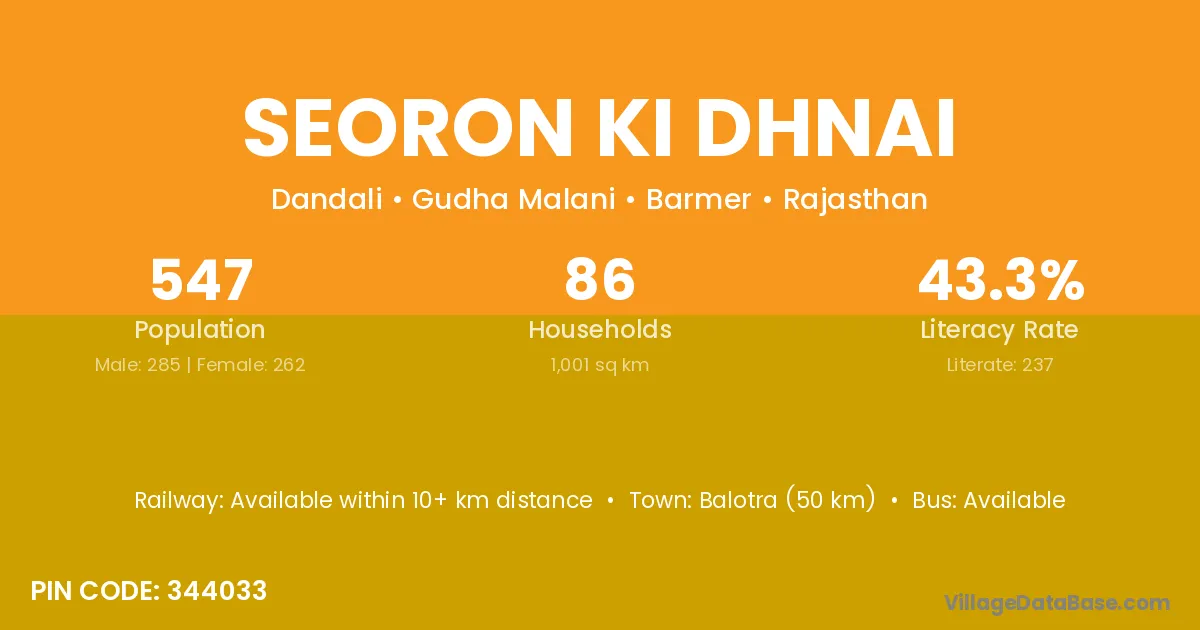 Balotra (50 km) is the nearest town to Seoron Ki Dhnai village for major economic activities and is located approximately 50 km away.