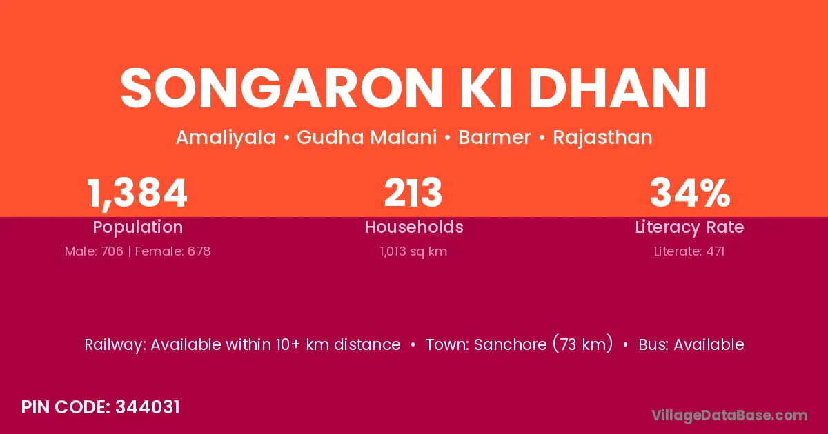 Songaron Ki Dhani village has a total population of 1,384 people, of which 706 are males and 678 are females.