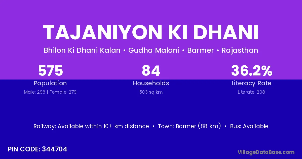 Barmer (88 km) is the nearest town to Tajaniyon Ki Dhani village for major economic activities and is located approximately 88 km away.
