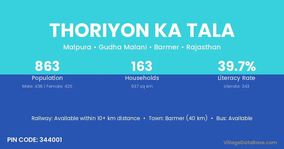 Barmer (40 km) is the nearest town to Thoriyon Ka Tala village for major economic activities and is located approximately 40 km away.