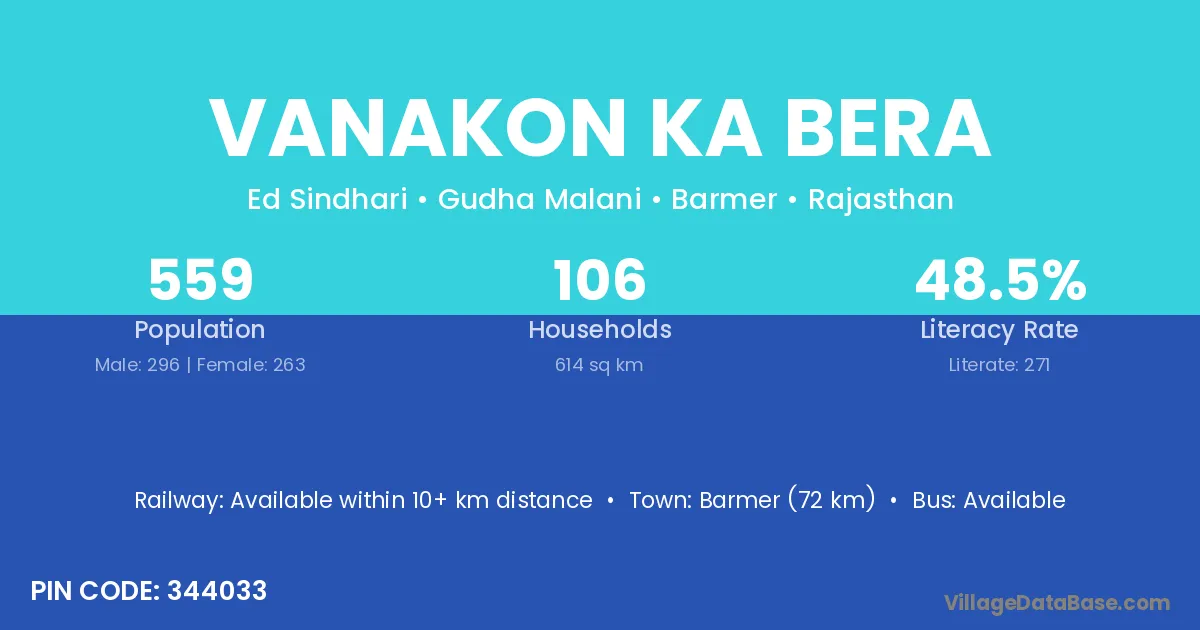 Barmer (72 km) is the nearest town to Vanakon Ka Bera village for major economic activities and is located approximately 72 km away.