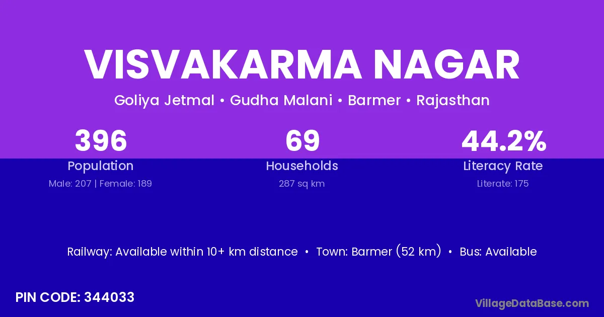 Barmer (52 km) is the nearest town to Visvakarma Nagar village for major economic activities and is located approximately 52 km away.