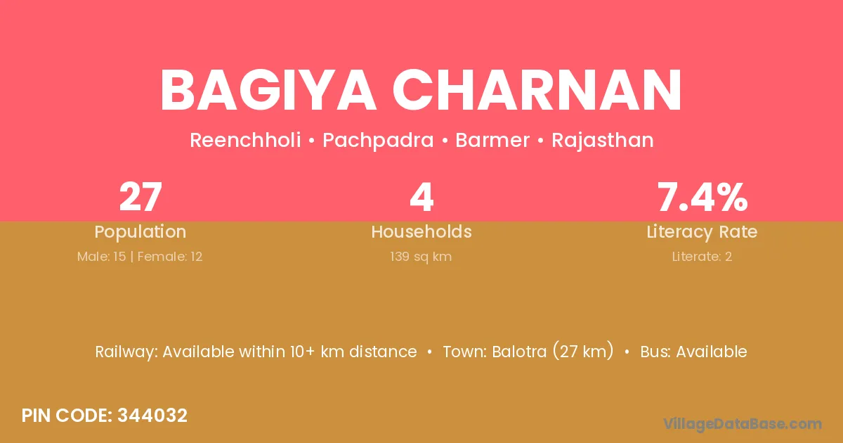 Balotra (27 km) is the nearest town to Bagiya Charnan village for major economic activities and is located approximately 27 km away.