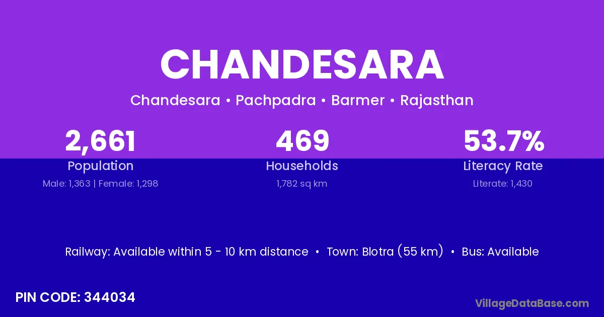 Blotra (55 km) is the nearest town to Chandesara village for major economic activities and is located approximately 55 km away.