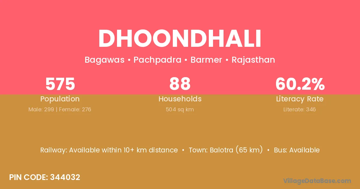 Balotra (65 km) is the nearest town to Dhoondhali village for major economic activities and is located approximately 65 km away.