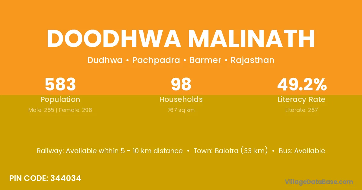 Balotra (33 km) is the nearest town to Doodhwa Malinath village for major economic activities and is located approximately 33 km away.
