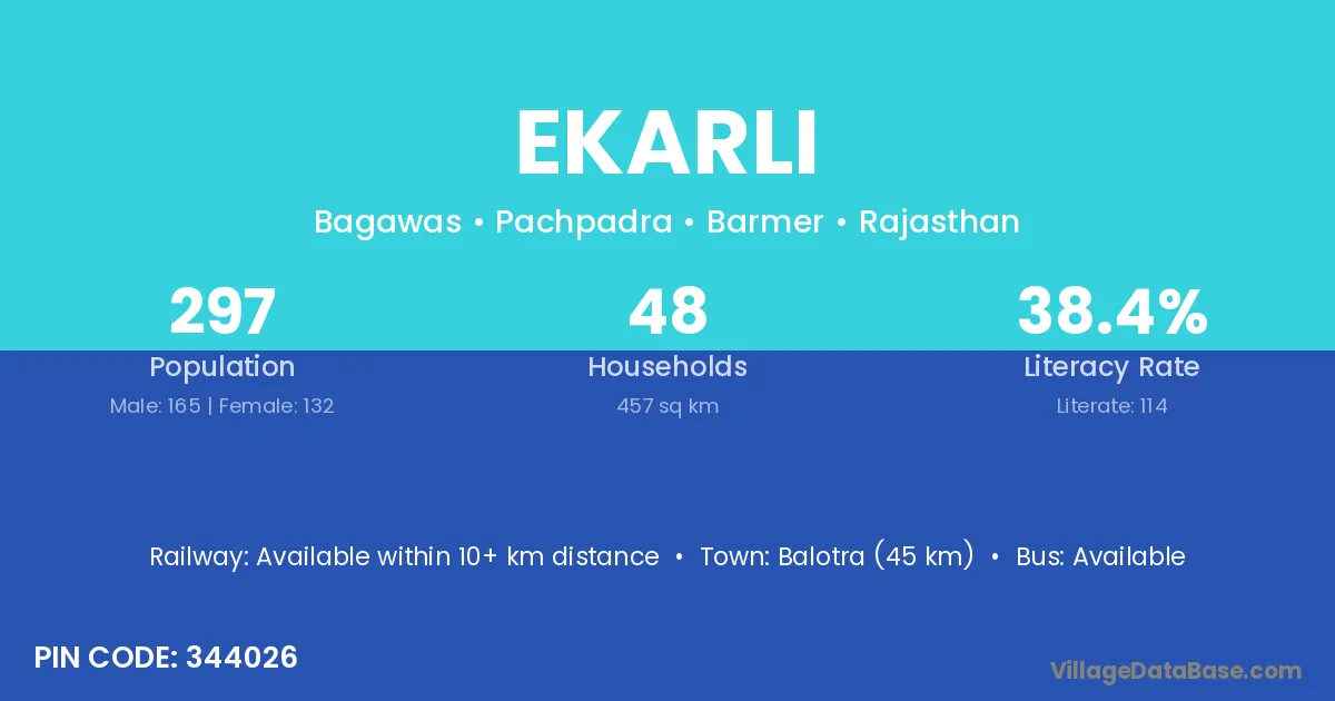Balotra (45 km) is the nearest town to Ekarli village for major economic activities and is located approximately 45 km away.