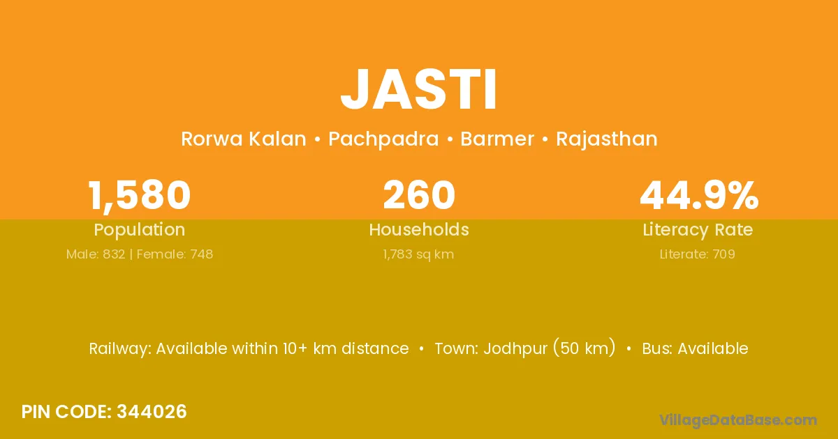 Jodhpur (50 km) is the nearest town to Jasti village for major economic activities and is located approximately 50 km away.