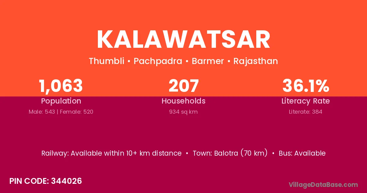 Balotra (70 km) is the nearest town to Kalawatsar village for major economic activities and is located approximately 70 km away.