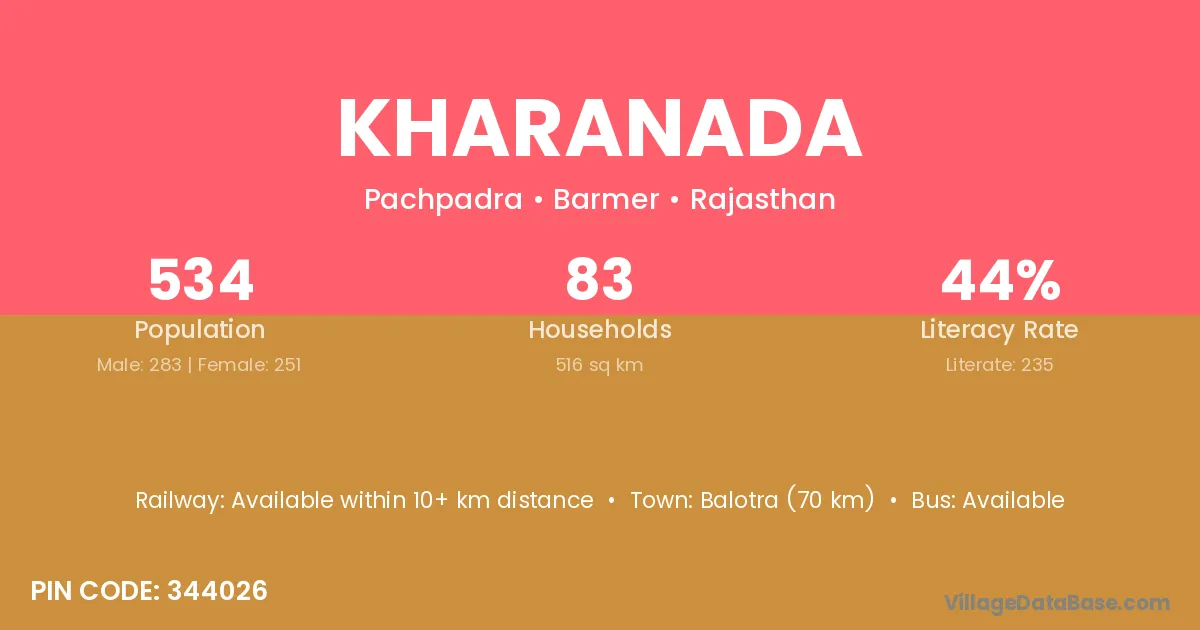 Balotra (70 km) is the nearest town to Kharanada village for major economic activities and is located approximately 70 km away.
