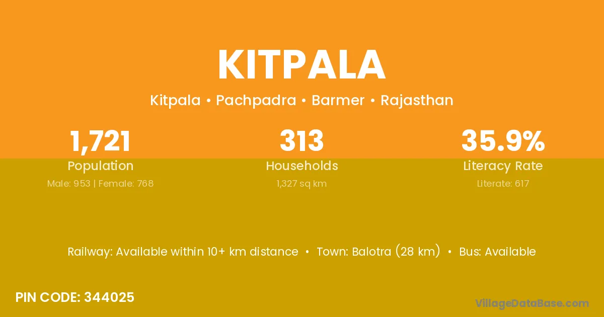 Balotra (28 km) is the nearest town to Kitpala village for major economic activities and is located approximately 28 km away.