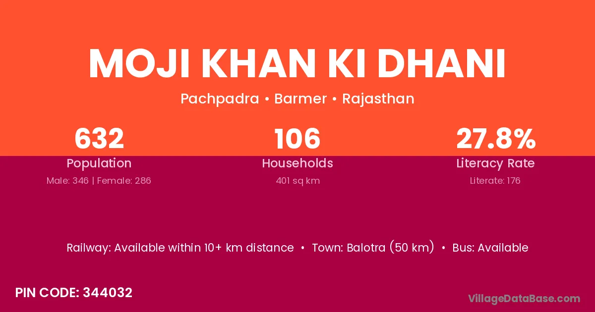 Balotra (50 km) is the nearest town to Moji Khan Ki Dhani village for major economic activities and is located approximately 50 km away.