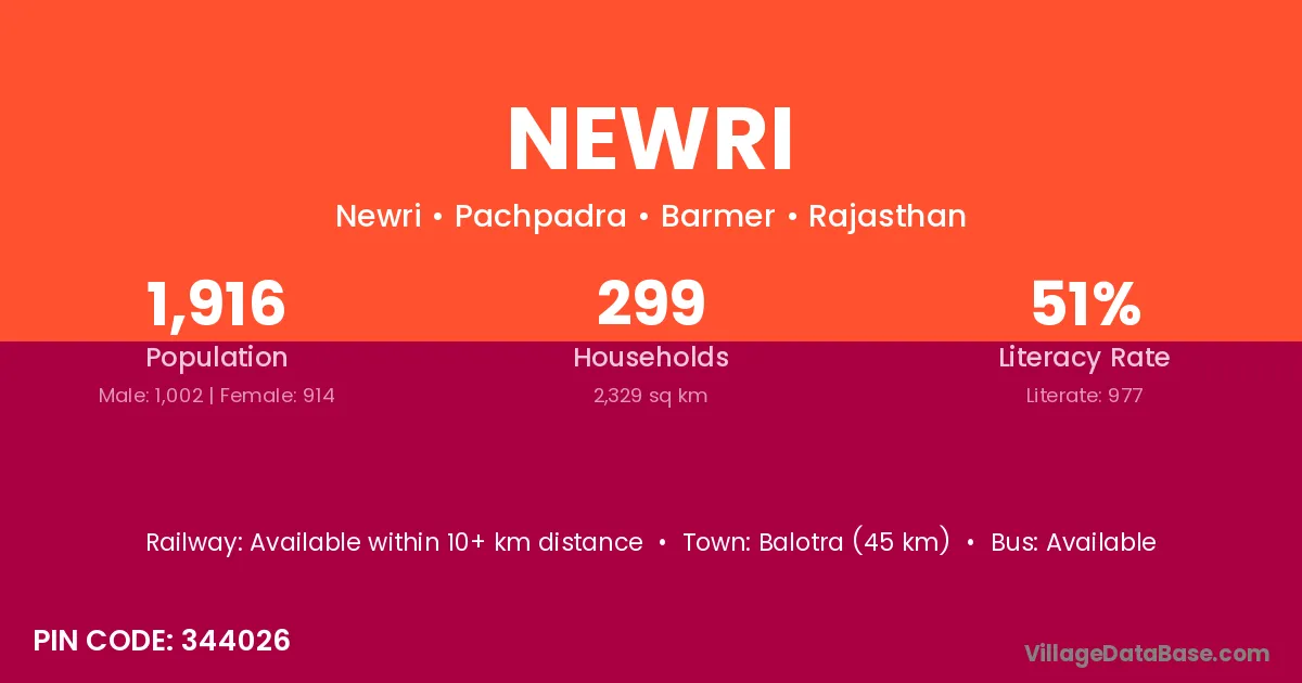 Balotra (45 km) is the nearest town to Newri village for major economic activities and is located approximately 45 km away.