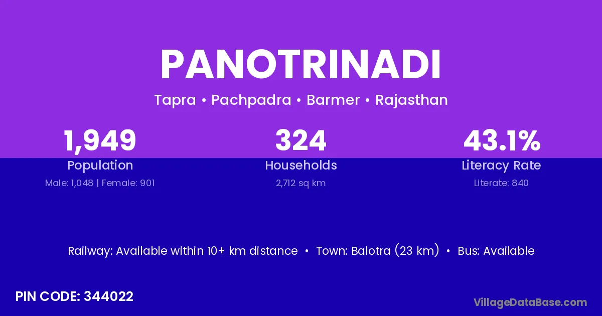 Balotra (23 km) is the nearest town to Panotrinadi village for major economic activities and is located approximately 23 km away.