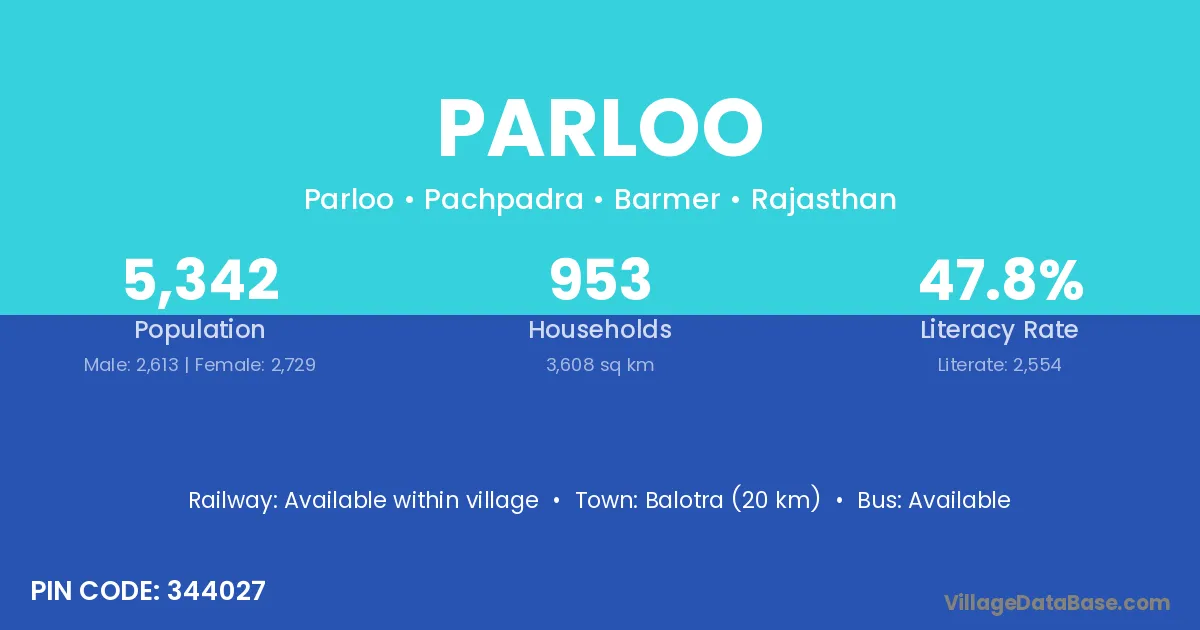 Balotra (20 km) is the nearest town to Parloo village for major economic activities and is located approximately 20 km away.