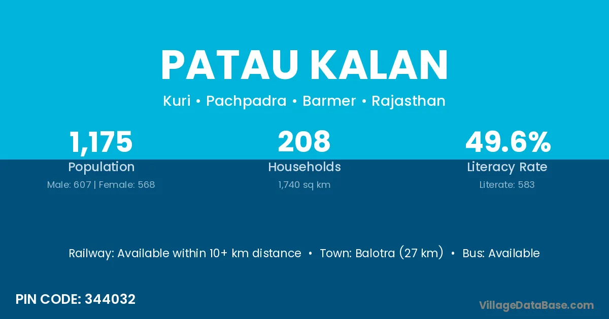 Balotra (27 km) is the nearest town to Patau Kalan village for major economic activities and is located approximately 27 km away.
