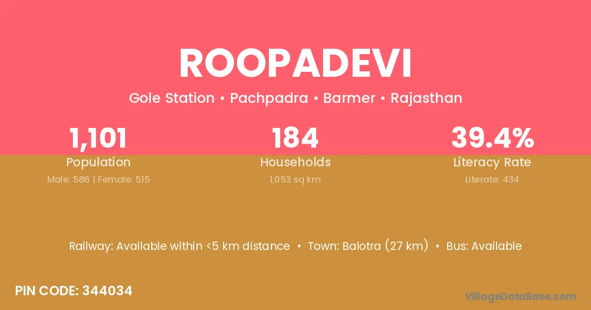 Balotra (27 km) is the nearest town to Roopadevi village for major economic activities and is located approximately 27 km away.