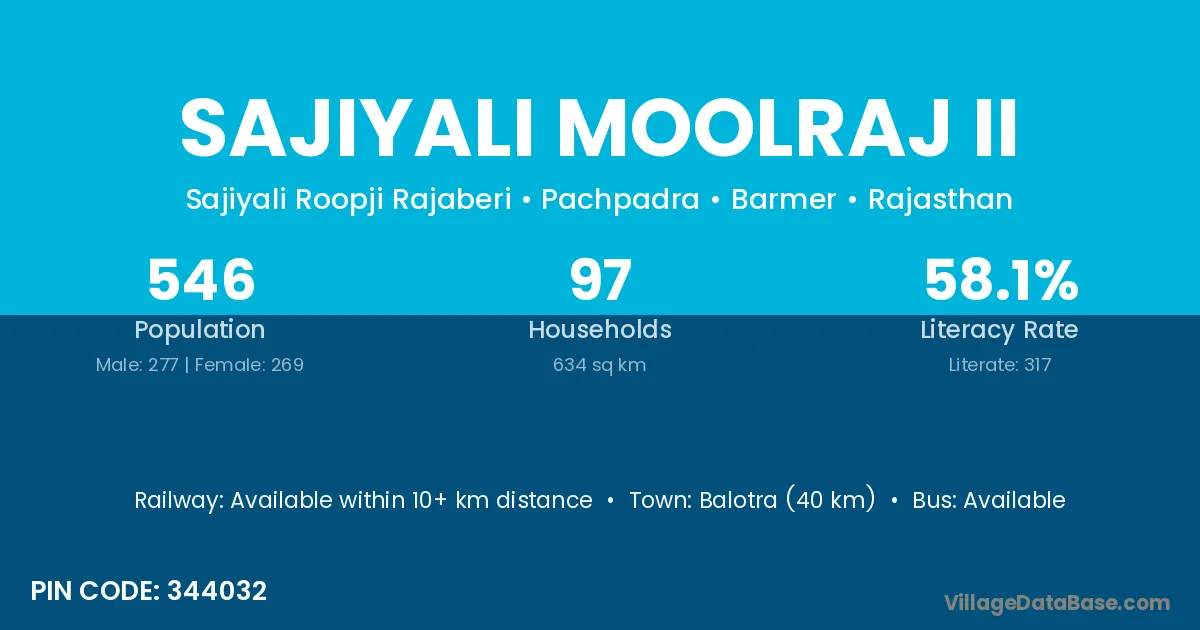 Balotra (40 km) is the nearest town to Sajiyali Moolraj Ii village for major economic activities and is located approximately 40 km away.