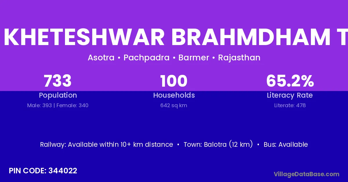 Balotra (12 km) is the nearest town to Shri Kheteshwar Brahmdham Tirth village for major economic activities and is located approximately 12 km away.