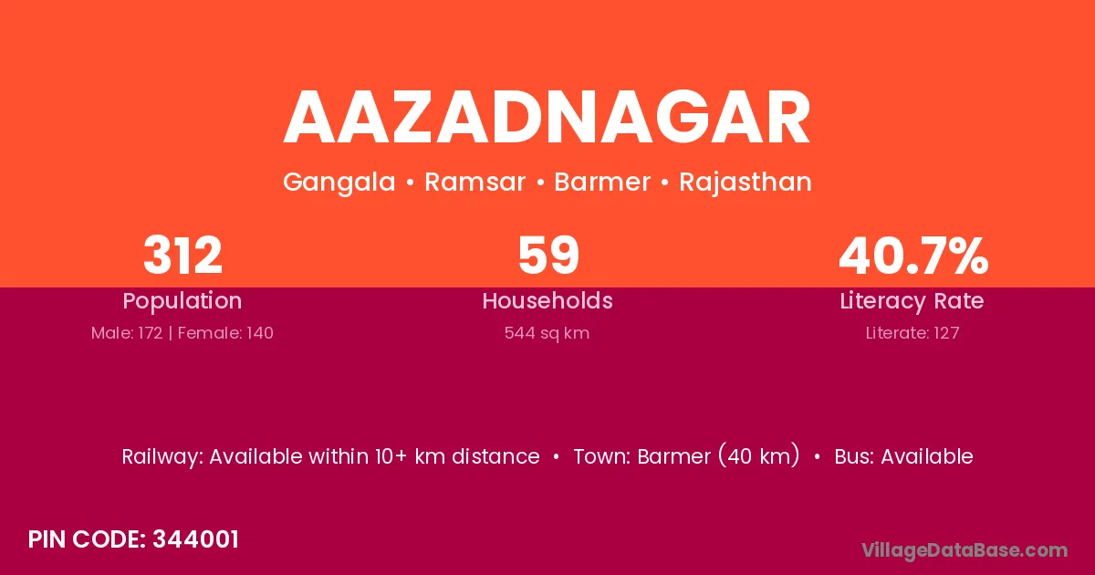 Barmer (40 km) is the nearest town to Aazadnagar village for major economic activities and is located approximately 40 km away.