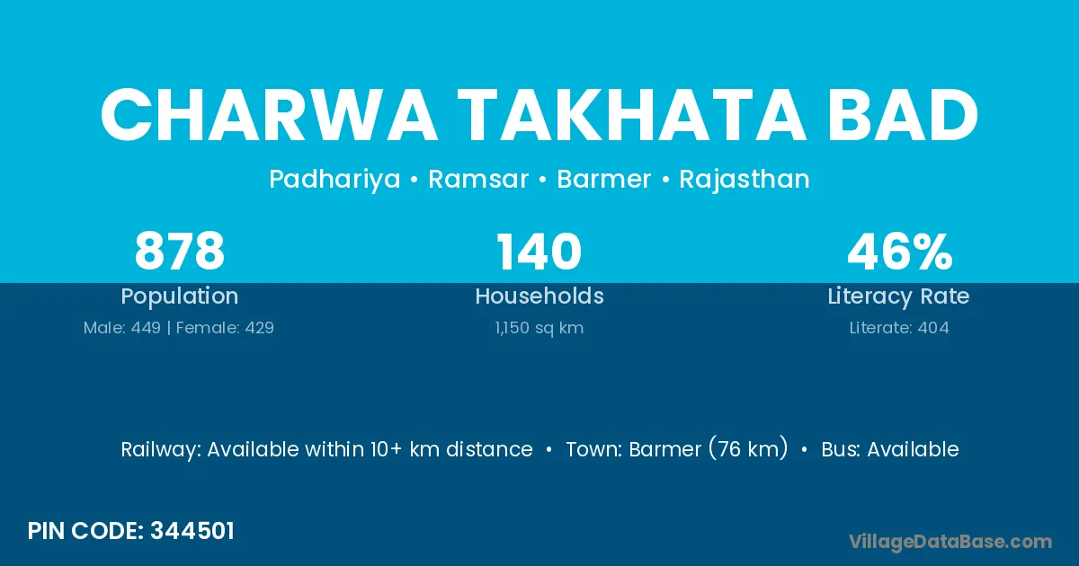 Barmer (76 km) is the nearest town to Charwa Takhata Bad village for major economic activities and is located approximately 76 km away.