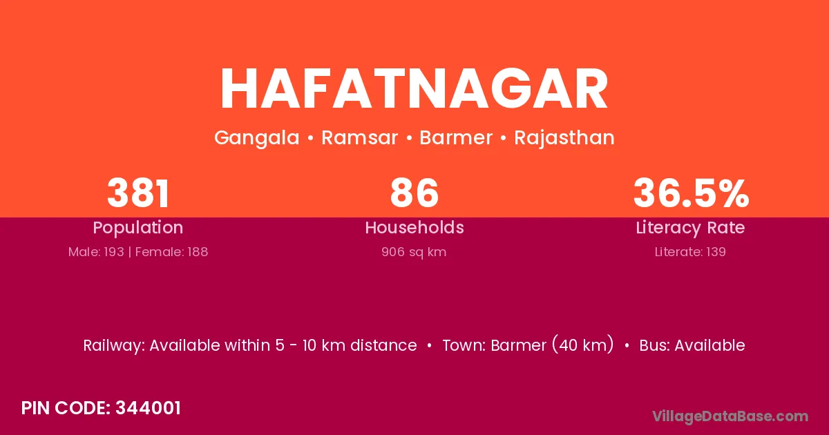 Barmer (40 km) is the nearest town to Hafatnagar village for major economic activities and is located approximately 40 km away.
