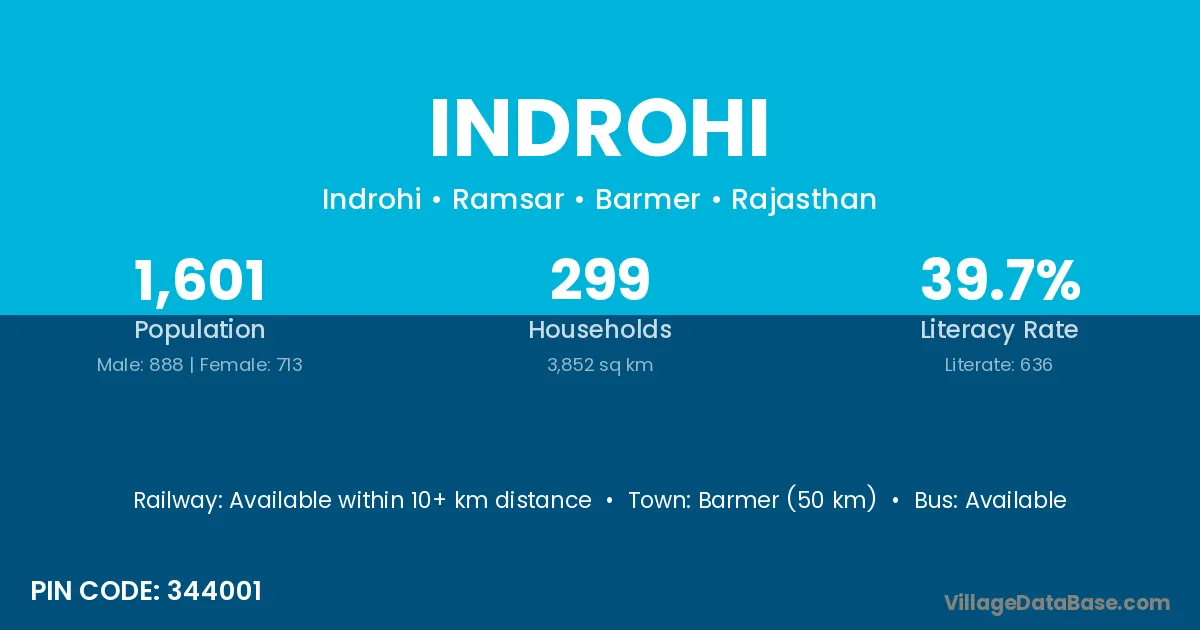 Barmer (50 km) is the nearest town to Indrohi village for major economic activities and is located approximately 50 km away.