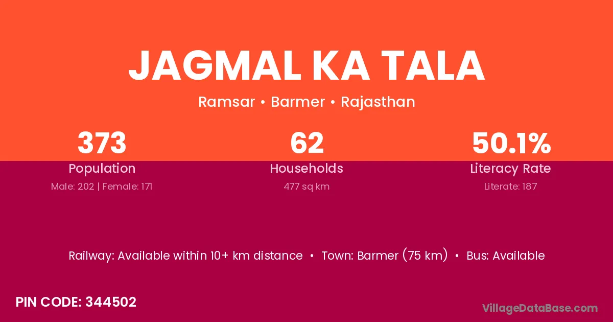 Jagmal Ka Tala village has a total population of 373 people, of which 202 are males and 171 are females.