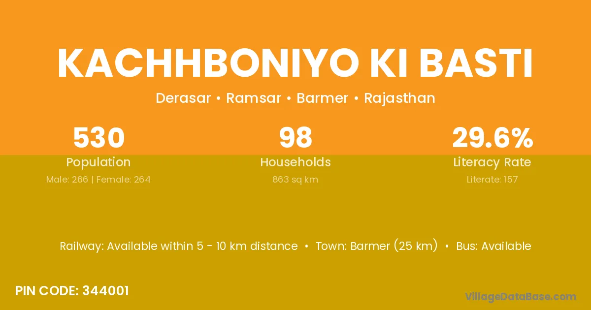 Kachhboniyo Ki Basti village has a total population of 530 people, of which 266 are males and 264 are females.