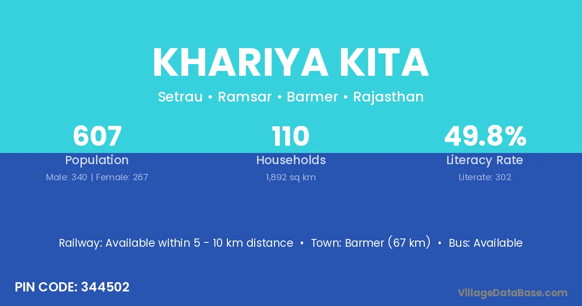 Barmer (67 km) is the nearest town to Khariya Kita village for major economic activities and is located approximately 67 km away.
