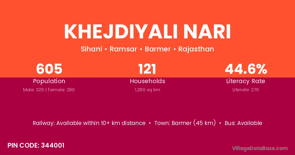 Barmer (45 km) is the nearest town to Khejdiyali Nari village for major economic activities and is located approximately 45 km away.