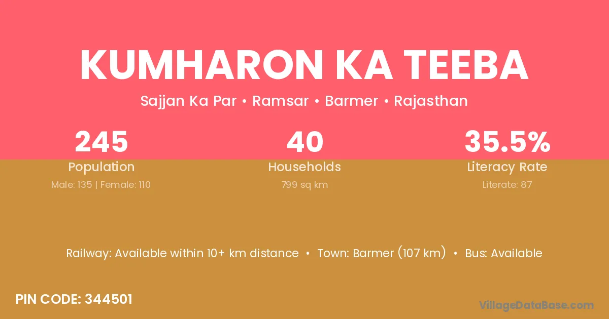 Kumharon Ka Teeba village has a total population of 245 people, of which 135 are males and 110 are females.