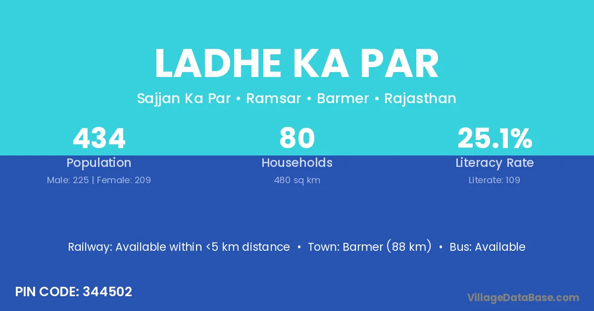 Barmer (88 km) is the nearest town to Ladhe Ka Par village for major economic activities and is located approximately 88 km away.