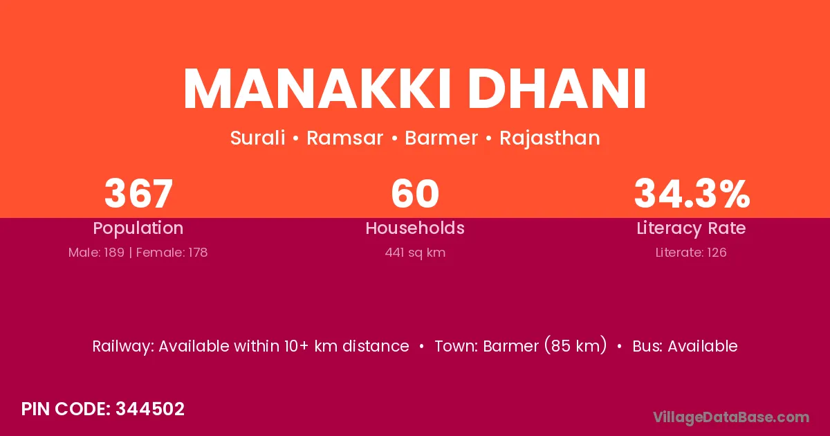 Barmer (85 km) is the nearest town to Manakki Dhani village for major economic activities and is located approximately 85 km away.