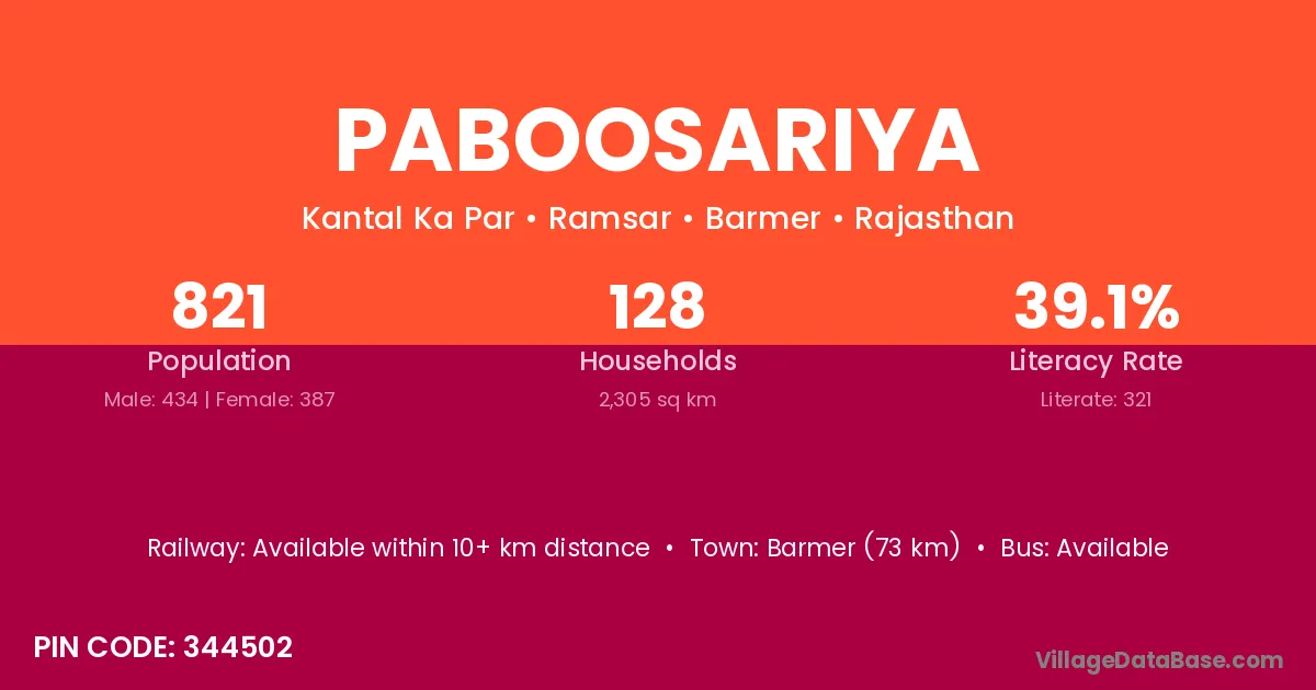 Barmer (73 km) is the nearest town to Paboosariya village for major economic activities and is located approximately 73 km away.