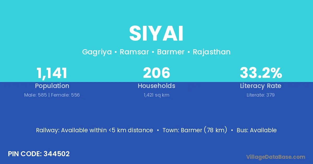 Barmer (78 km) is the nearest town to Siyai village for major economic activities and is located approximately 78 km away.