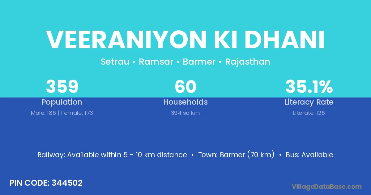 Veeraniyon Ki Dhani village has a total population of 359 people, of which 186 are males and 173 are females.