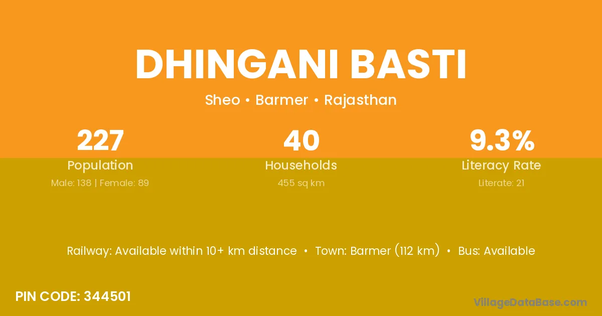 Barmer (112 km) is the nearest town to Dhingani Basti village for major economic activities and is located approximately 112 km away.