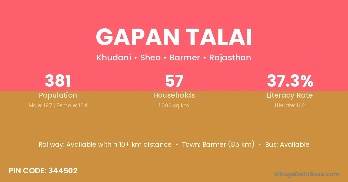 Barmer (85 km) is the nearest town to Gapan Talai village for major economic activities and is located approximately 85 km away.