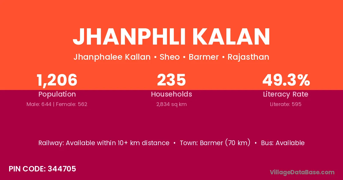 Barmer (70 km) is the nearest town to Jhanphli Kalan village for major economic activities and is located approximately 70 km away.