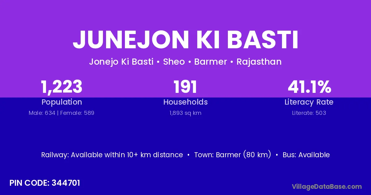 Barmer (80 km) is the nearest town to Junejon Ki Basti village for major economic activities and is located approximately 80 km away.