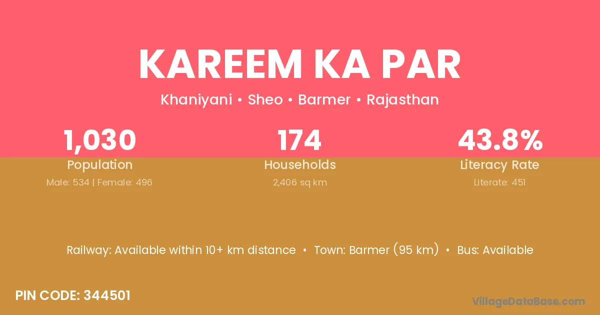 Barmer (95 km) is the nearest town to Kareem Ka Par village for major economic activities and is located approximately 95 km away.