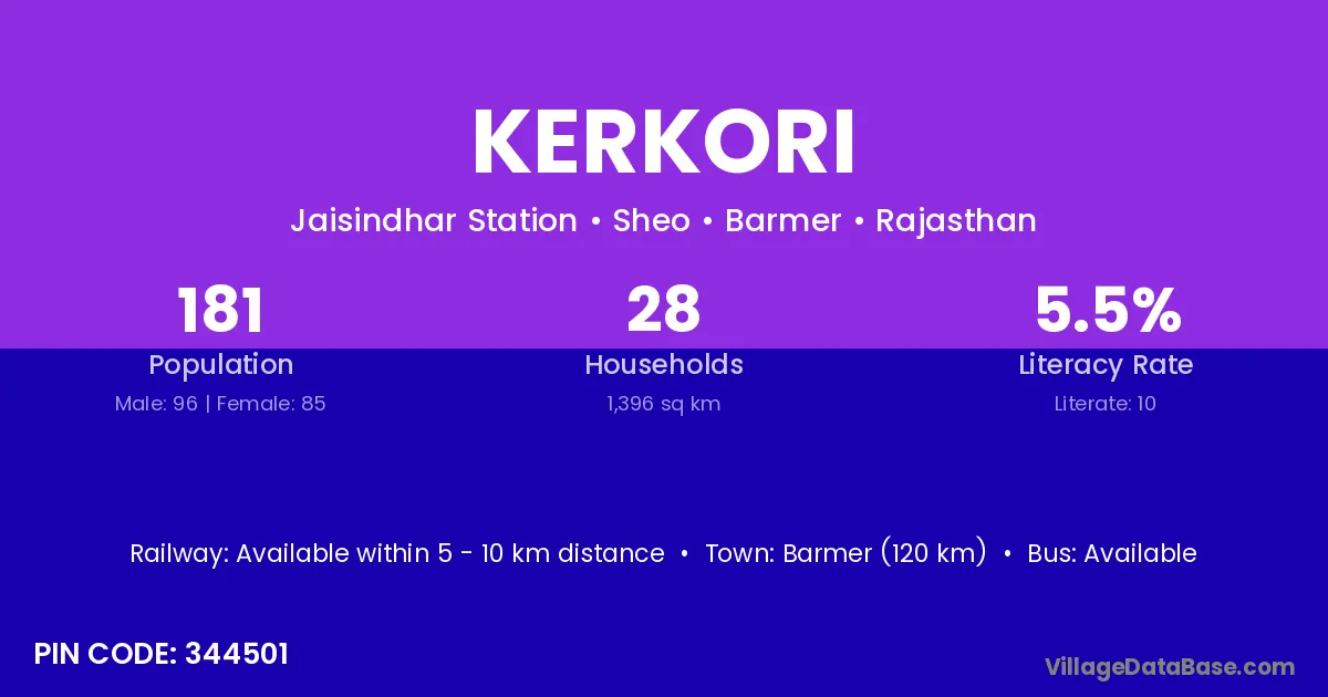 Barmer (120 km) is the nearest town to Kerkori village for major economic activities and is located approximately 120 km away.