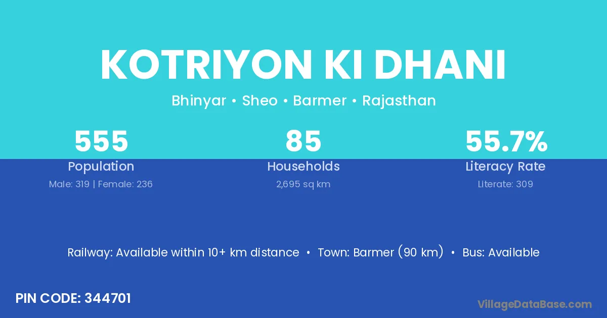 Barmer (90 km) is the nearest town to Kotriyon Ki Dhani village for major economic activities and is located approximately 90 km away.