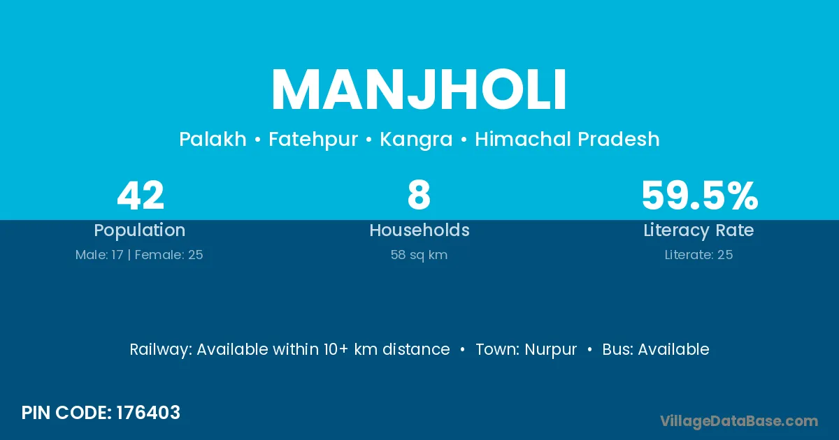 The literacy rate of Manjholi village is 50.65%. Male literacy stands at 69.23% and female literacy at 31.58%.
