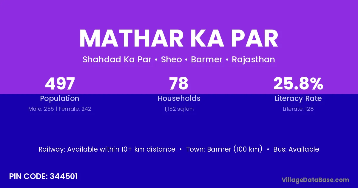 Barmer (100 km) is the nearest town to Mathar Ka Par village for major economic activities and is located approximately 100 km away.