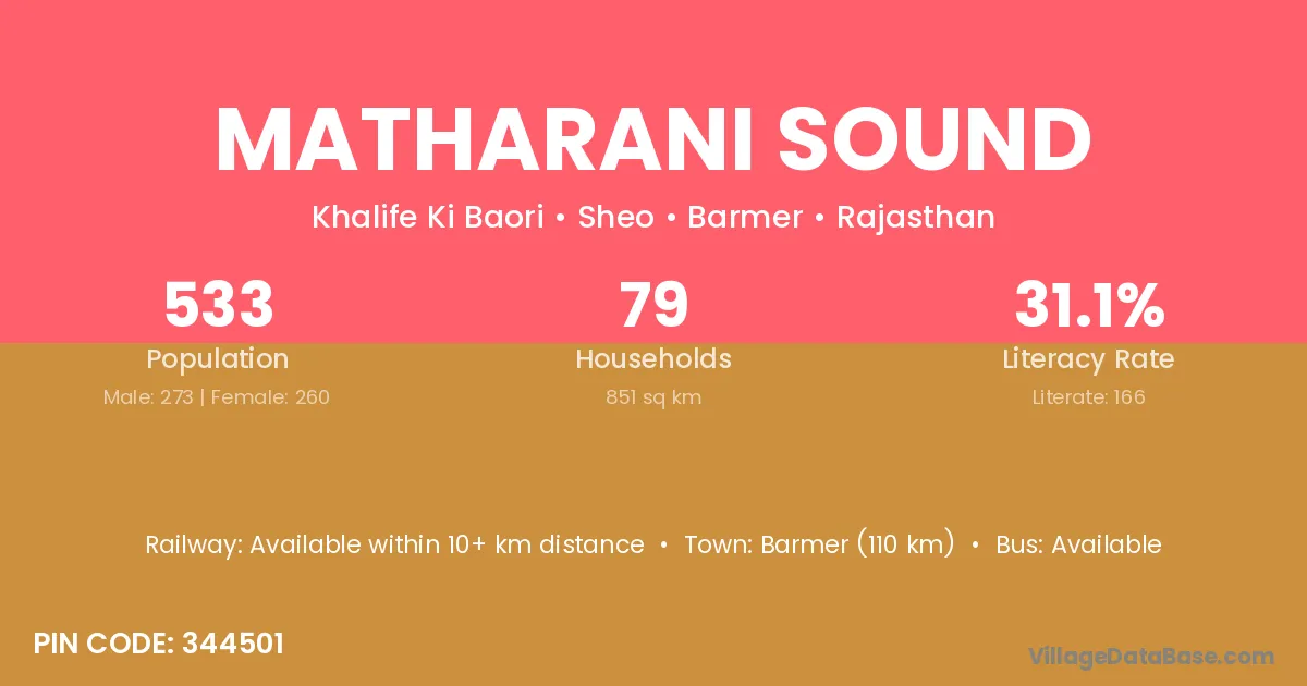 Matharani Sound village has a total population of 533 people, of which 273 are males and 260 are females.