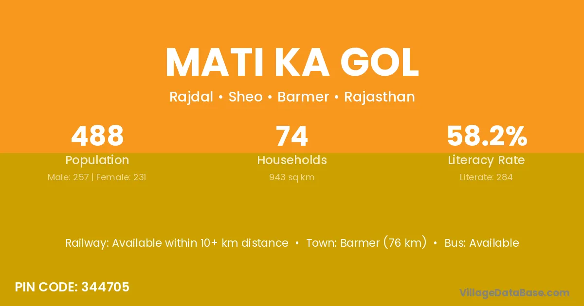 Barmer (76 km) is the nearest town to Mati Ka Gol village for major economic activities and is located approximately 76 km away.