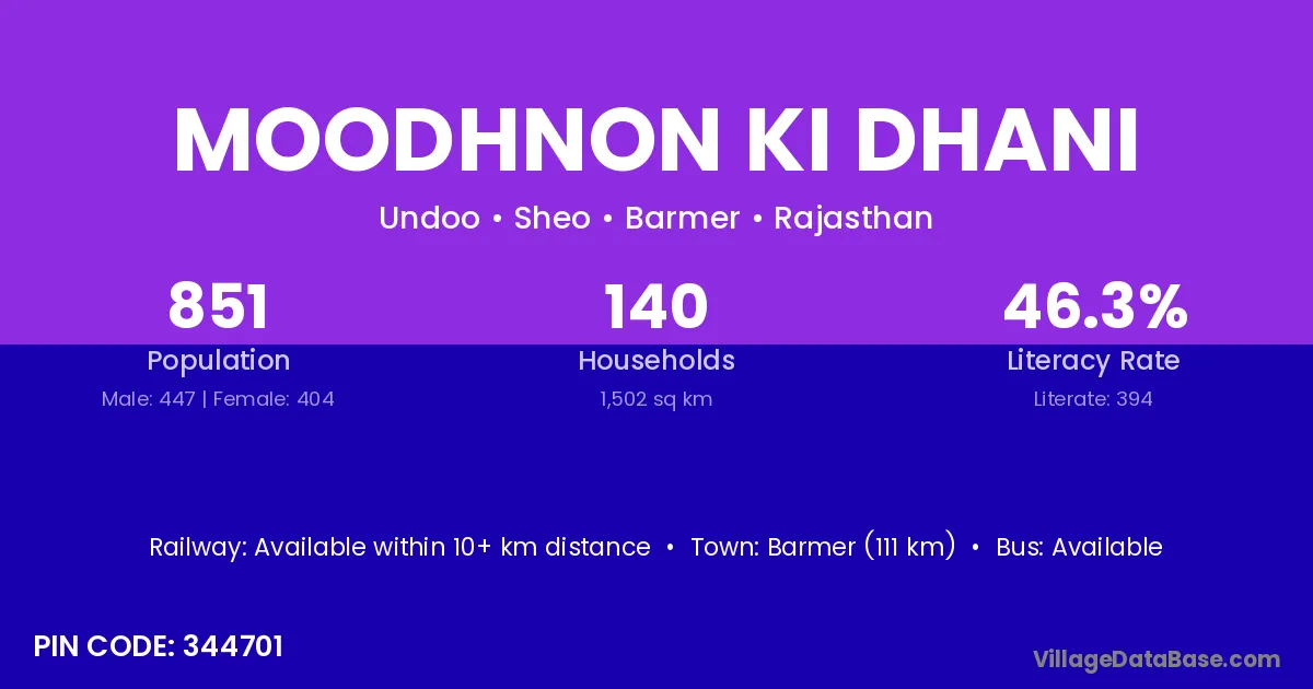Moodhnon Ki Dhani village has a total population of 851 people, of which 447 are males and 404 are females.