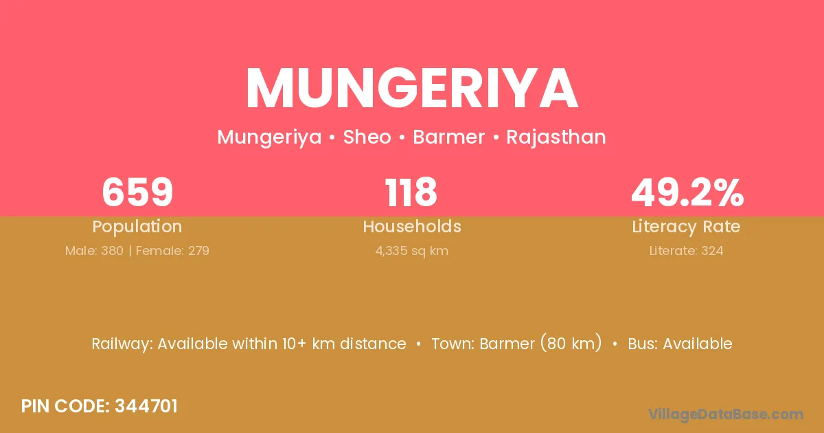 Barmer (80 km) is the nearest town to Mungeriya village for major economic activities and is located approximately 80 km away.